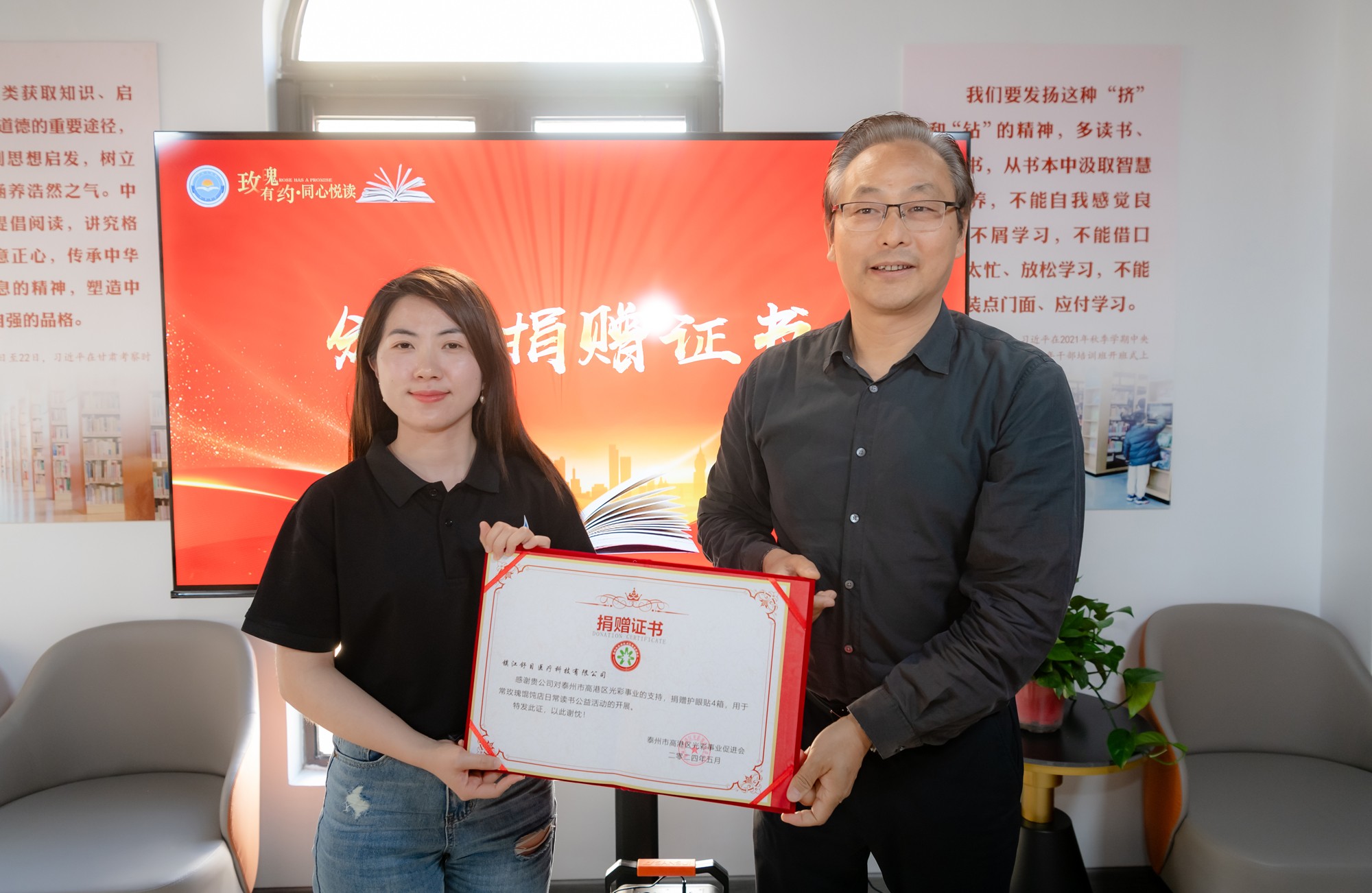 活动现场,泰州市天康医疗器械有限公司、江苏祥安建设工程有限公司、镇江舒目医疗科技有限公司等热心企业捐钱捐物,用于常玫瑰馄饨店开展公益活动。泰州职业技术学院与常玫瑰馄饨店深化“校企共建”,成立“玫瑰有约”流动图书站,泰州职业技术学院为“玫瑰有约”读书吧提供图书800册。泰州医药高新区(高港区)党工委委员、区委常委、宣传和统战部部长张洁;高港区政协副主席、区工商联主席周正青分别为3家企业颁发捐赠证书。高港区工商联党组书记、区光彩事业促进会会长王䶮接受3家企业捐赠。